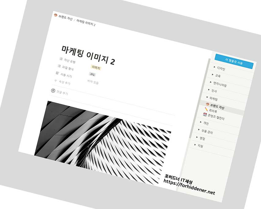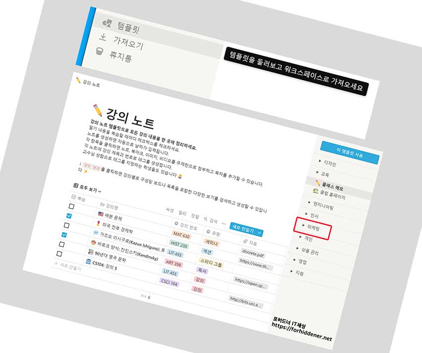왼쪽에 있는 카테고리중에 [템플릿]을 클릭 하면? 두번째 첨부한 스크린샷과 같이 강의 노트 템플릿이 열립니다. 강의 노트 템플릿 외에도 '마케팅'항목에 들어가면?