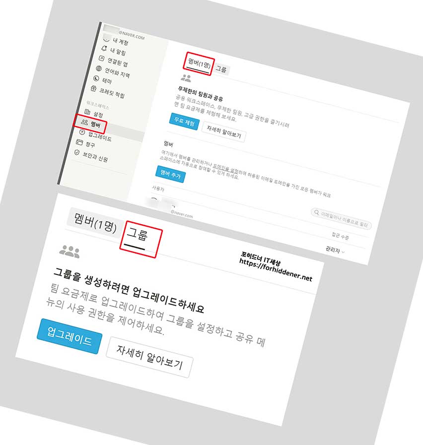 왼쪽 카테고리 항목중 [멤버]를 클릭하면? 개인, 단체 (그룹) 이 나오는데, 무료버전에서는 팀원과 공유를 할 수가 없고 고급 권한 공용 워크스테이션 요금제에서 '무료 체험'으로 일정 기간동안 무료로 사용을 할 수 있습니다. 멤버에는 멤버 관리를 하거나 도메인을 설정해 허용된 이메일 도메인을 가진 모든 멤버가 위크스페이스에 자동으로 참여할 수 있습니다. 그룹 탭 역시 '팀 요금제'로 업그레이드 해야지만 접근이 가능합니다.