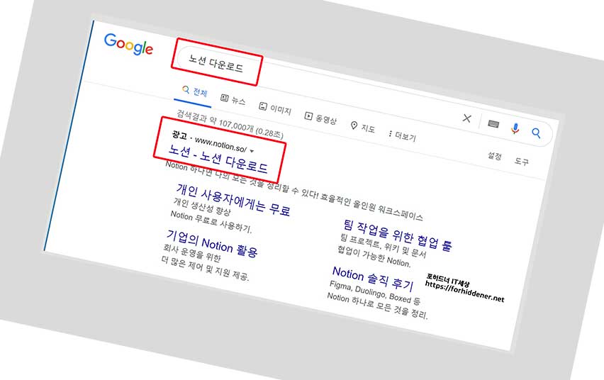 google에서 사진과 같이 '노션 다운로드' 를 검색하시거나 (바로가기) 를 이용하시면 공식 사이트에 접속하실 수 있습니다.