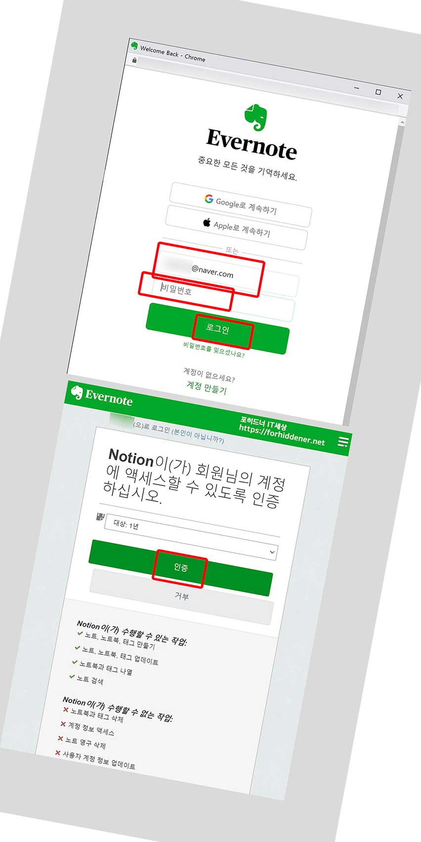 좌측 카테고리에서 [가져오기]를 클릭 후 Evernote 앱을 클릭합니다. 스크린샷과 같이 Evernote 계정에 이메일 정보를 입력해 로그인을 합니다. 다음에 뜨는 Notion이 회원님의 계정에 액세스할 수 있도록 인증하십시오 에서 대상 1년 또는 보기에 알맞는 년수를 선택 한 후 인증을 합니다. 1년간 인증을 할 수 있게 대상 1년을 선택 했습니다.