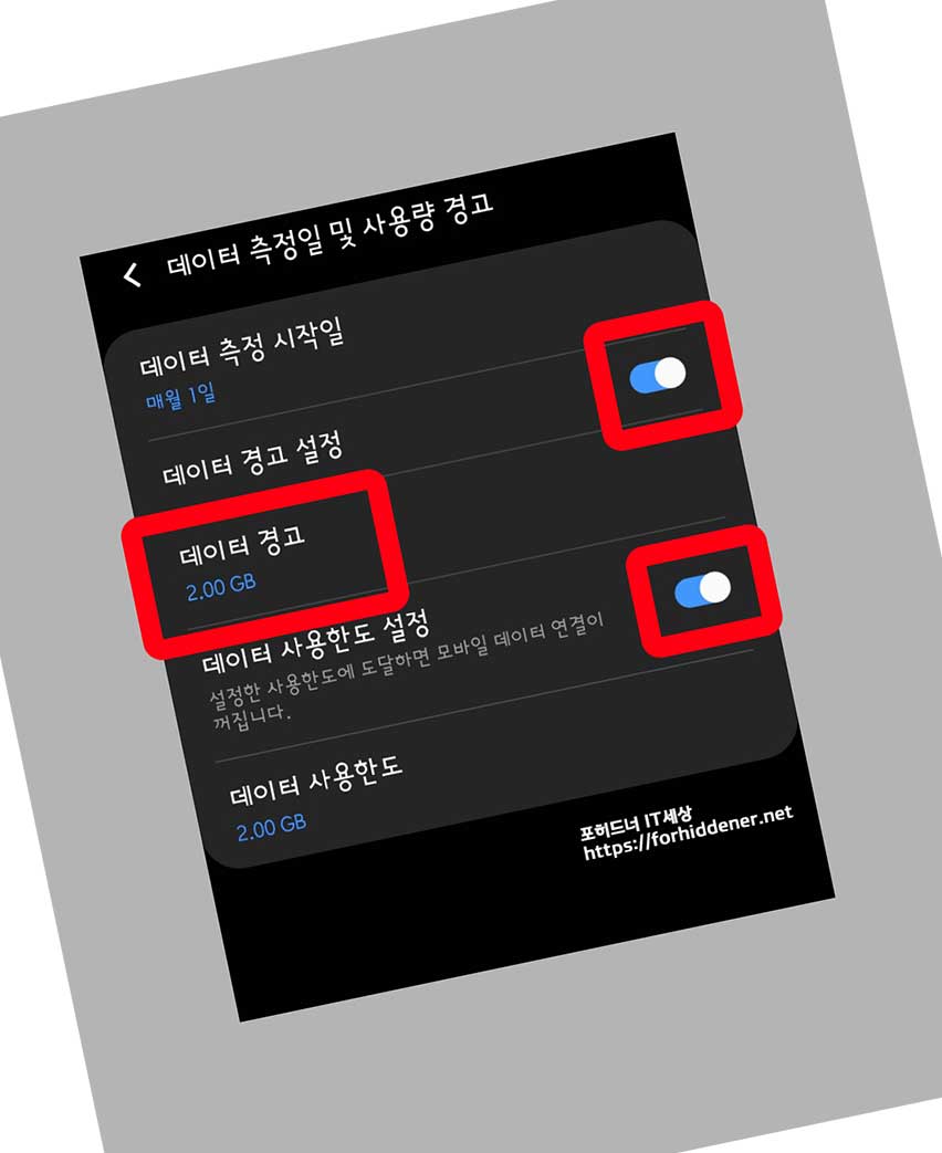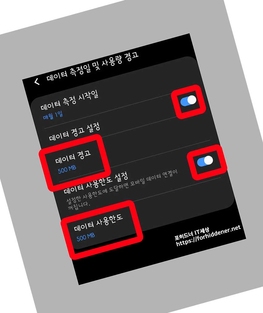 경고와 사용한도가 같게 했는데, 경고를 400MB로 해놓으면 더 좋을것 같습니다. 만약 2GB 기본제공량의 요금제를 사용중이시라면? 사용한도는 2GB로, 경고는 1.7GB로 설정을 해주시면 되겠습니다. 중요한 것은? 동그라미 버튼이 모두 오른쪽으로 이동시켜 기능을 활성화 시켜줘야 기능이 작동합니다.