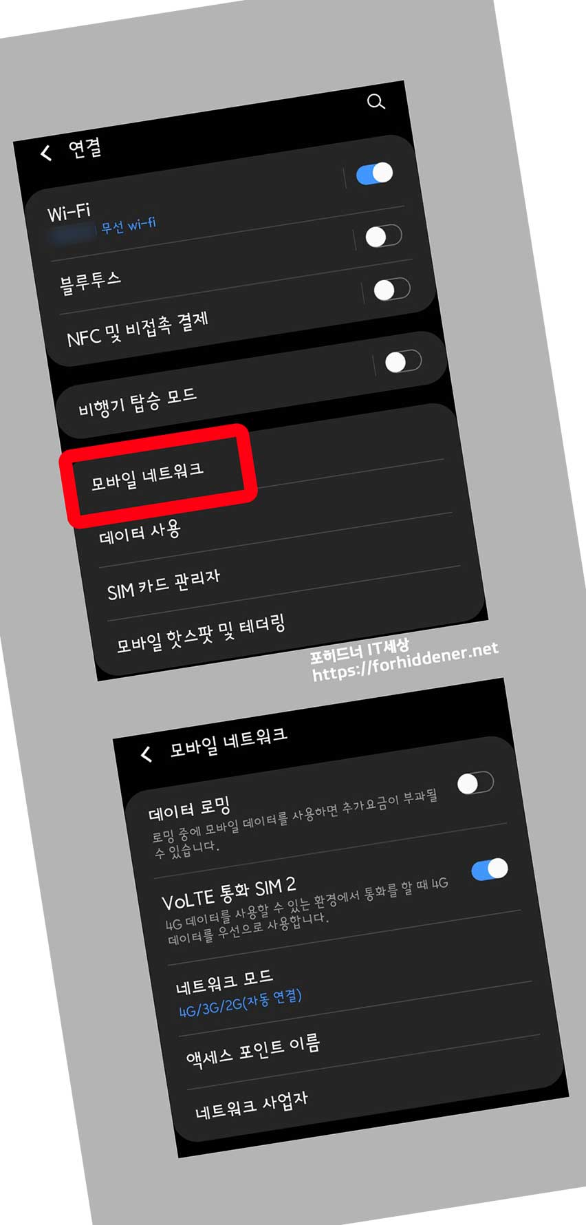 '데이터 사용'에 들어가야 합니다. 그전에 '모바일 네트워크'에 들어가면? 네트워크 모드를 (3G, 2G, 4G)로 자동 연결이 되게 설정을 할 수 있습니다. 특정 주파수 (4G, 5G) 또는 (3G/2G) 자동연결되게 셋팅할 수 있습니다.